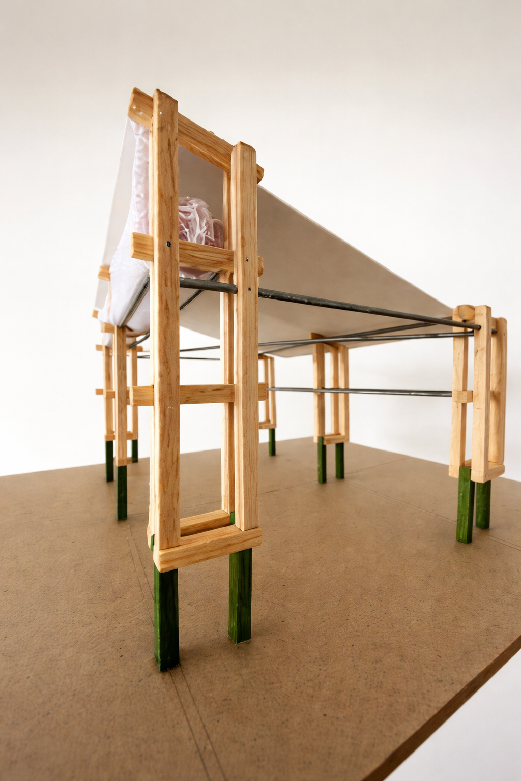 Se plantea un módulo desmontable de 4×3 metros, construido con madera y metal, que permita una instalación flexible y segura mediante una cubierta tensada.